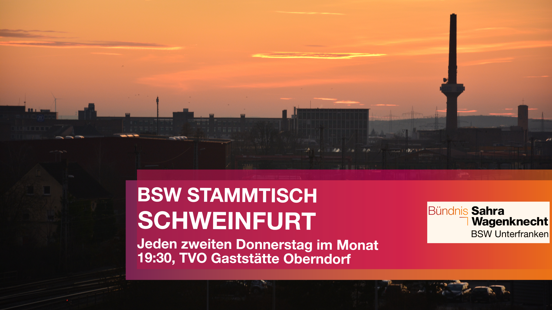 Wir möchten euch deshalb zu dem regelmäßig stattfindenden politischen Stammtisch des BSW in Schweinfurt einladen, um euren Anregungen eine Plattform zu bieten, uns gegenseitig zu vernetzen und mit einer geeinten, konstruktiven und lauten Stimme aufzutreten.