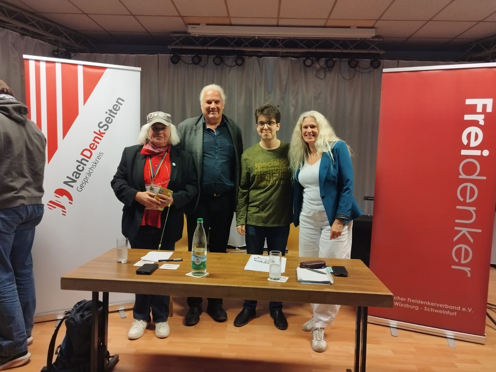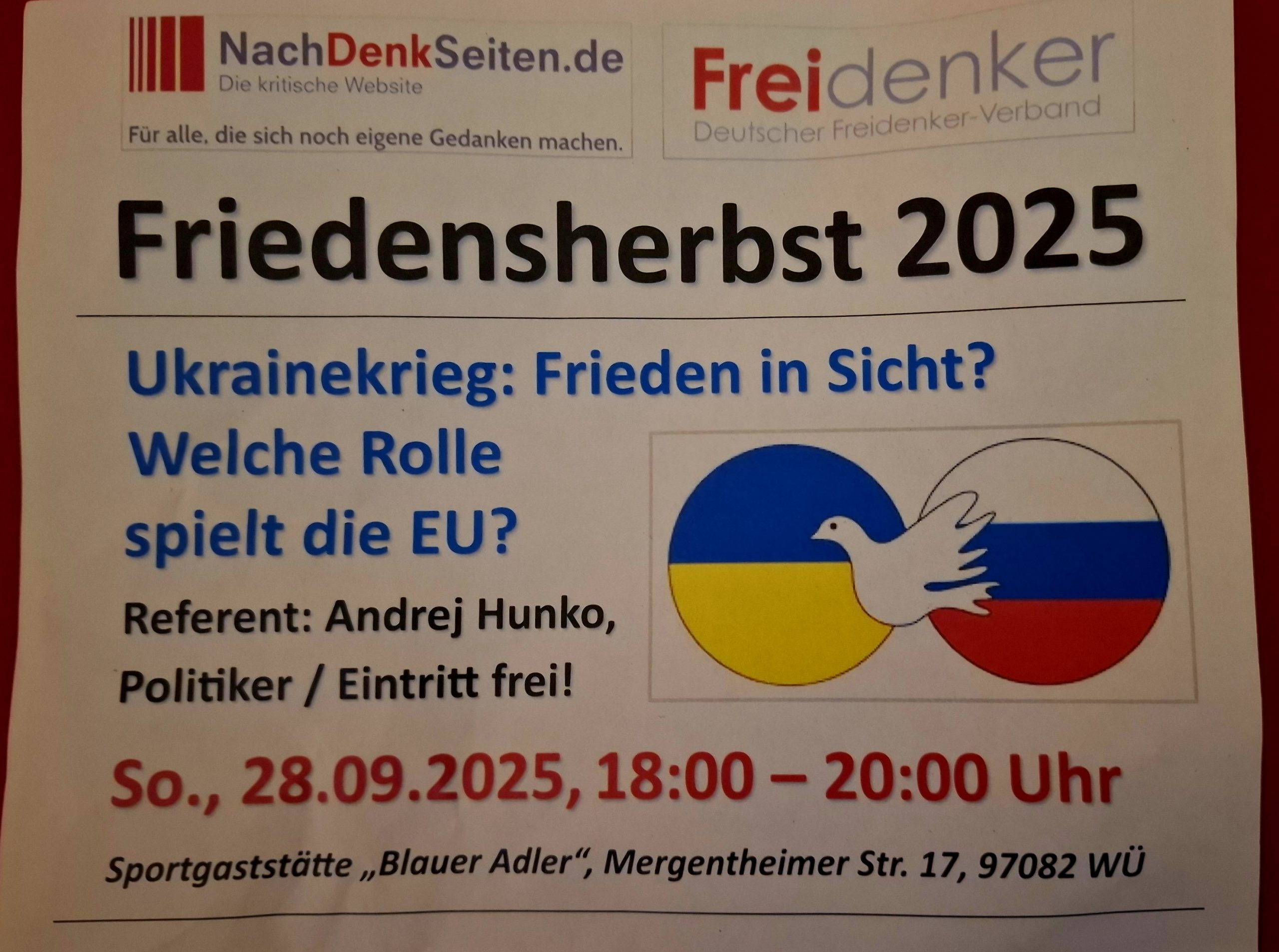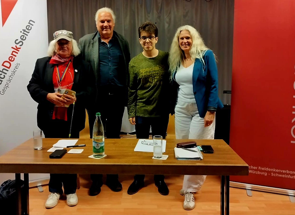 Der NachDenkSeiten-Gesprächskreis SW/WÜ und der Deutsche Freidenkerverband SW/WÜ luden am 28. September um 18Uhr zu einer Veranstaltung in die Sportgaststätte Blauer Adler. Geboten wurde ein Vortrag zum Thema „Ukrainekrieg: Frieden in Sicht? Welche Rolle spielt die EU?“. Referent war Andrej Hunko vom BSW Nordrhein-Westfalen. Andrej Hunko hat seit den 2010er Jahren für den Europarat die Ukraine und Russland besucht. Außerdem hat er zahlreiche Wahlbeobachtungen für Europarat, OSZE und den Auswärtigen Ausschuss durchgeführt. Andrej Hunko berichtete anschaulich von der Entwicklung in der Ukraine bis heute. Im Anschluß gab es eine Fragerunde zur Thematik. Vom BSW nahmen teil: Bella Repplinger (Co Vorsitzende BSW Bezirk Unterfranken), Anke von Rothkirch und Max Materi. Von der Veranstaltung wurde ein Video erstellt. Informationen auf der Webseite der NachDenkSeiten https://www.nachdenkseiten.de/ und des Deutschen Freidenkerverbands https://www.freidenker.org/